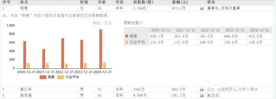 可以看出,程雪已经在海天味业工作了三十多年,从工程师一路升任为了公司的董事长。程雪2024年薪酬为913.5万元,相较于2023年的669.8万元,上涨了243.7万元,为公司最高的薪酬。