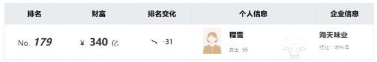 近日,2025年胡润百富榜发布,其中海天味业董事长程雪以340亿元的身家入选百富榜。